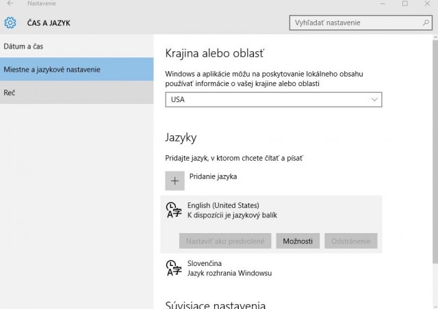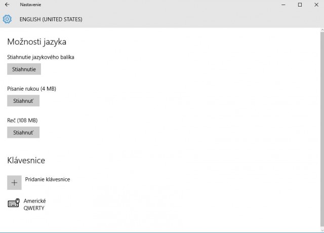 Vojdite do (nových) nastavení a vyberte položku „Čas a jazyk“. Vyberte miestne a jazykové nastavenia a zmeňte krajinu na USA. Následne pridajte jazyk, a to „English (United States)“. Po pridaní jazyka, kliknite na angličtinu a vyberte možnosti. V tejto možnosti je nutné stiahnuť jazykový balík, písanie rukou a predovšetkým reč. Stiahnu sa vám súbory o veľkosti približne 140MB.