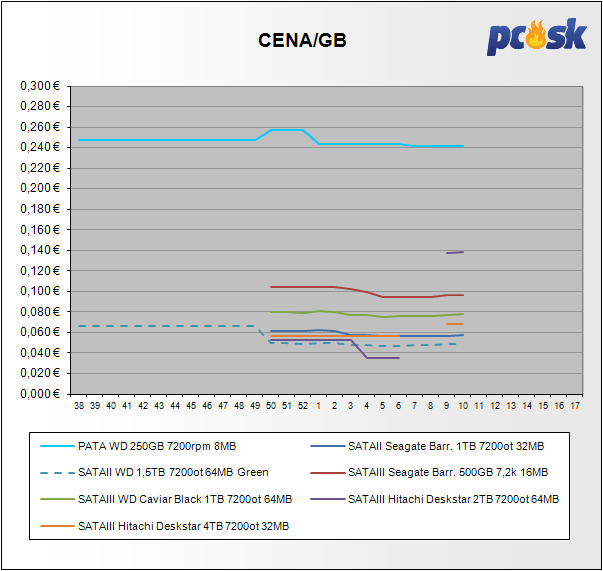 Najlepšie ceny za 1GB diskovej kapacity sú nasledovné: PATA na 320GB, SATAII na 1500GB, SATAIII na 3000GB. U SSD MLC to je 240GB a 32GB pre SLC. Z prehľadu vyúpadli SSD OCZ Agility 3 Series 120GB MLC 2,5" a OCZ Agility 3 Series 240GB MLC 2,5".