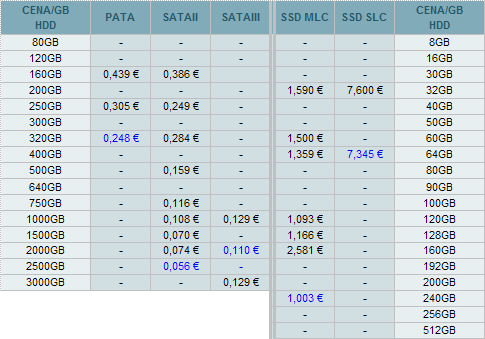 Najlepšie ceny za 1GB diskovej kapacity sú nasledovné: PATA na 320GB, SATAII na 2500GB, SATAIII na 2000GB. U SSD MLC to je 240GB a 64GB pre SLC.