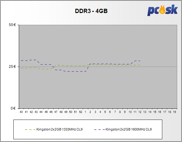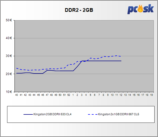 Ceny pamätí DDR a DDR2 sa menili len miene od +2,6% do -1,3%. U DDR3 boli zmeny od +8,5% do -8,9%. Z prehľadu vypadla pamäť Kingston 2x1GB DDRII 400 CL3.