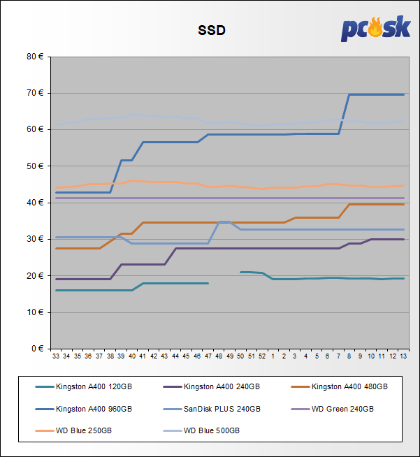 Platňové disky menili ceny od +1,1% až do -10,2%. U SSD nastali zmeny do +1,1%.