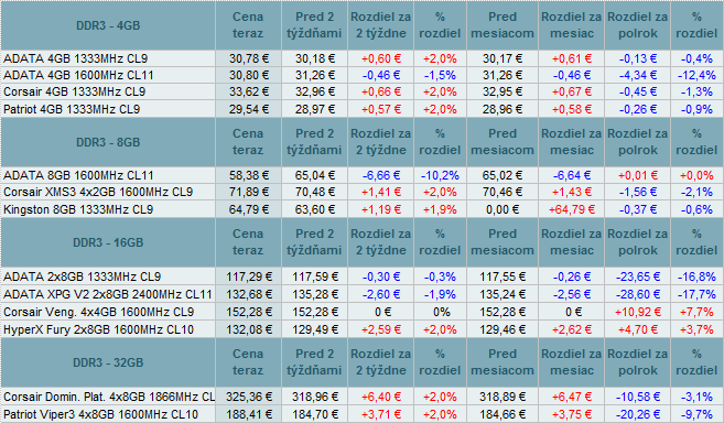 Pamäte DDR, DDR2 a DDR4 zdraželi do 6,2%. DDR3 menili ceny od +2,0% až do -10,2%.