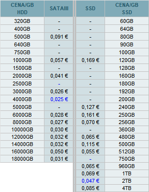 Najlepšie ceny za 1GB diskovej kapacity sú nasledovné: SATAIII 4000GB a SSD 2TB.