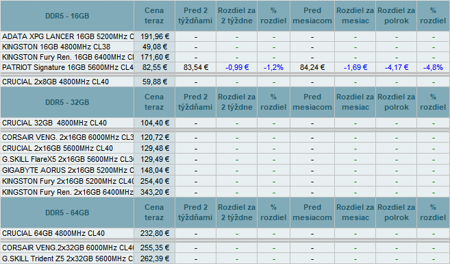 Pamäte DDR3 zlacneli do -1,3%. U DDR4 boli zmeny od vysokých +34,4% až do -31,1%. DDR5 zlacneli do -1,2%. Z prehľadu vypadli Patriot Viper Steel 2x8GB 4133MHz CL19 (DDR4) a Corsair Veng. 4x4GB 1600MHz CL9 (DDR3) (DDR4). Do prehľadu som pridal nové modely DDR5.