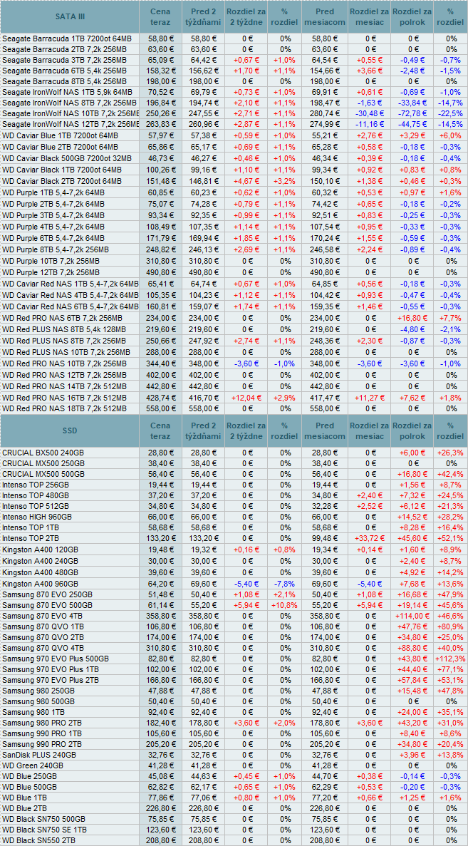 Platňové disky menili ceny od +3,2% do -1,0%. U SSD nastali zmeny od +10,8% do -7,8%. Z prehľadu vypadol SSD CRUCIAL MX500 1TB.