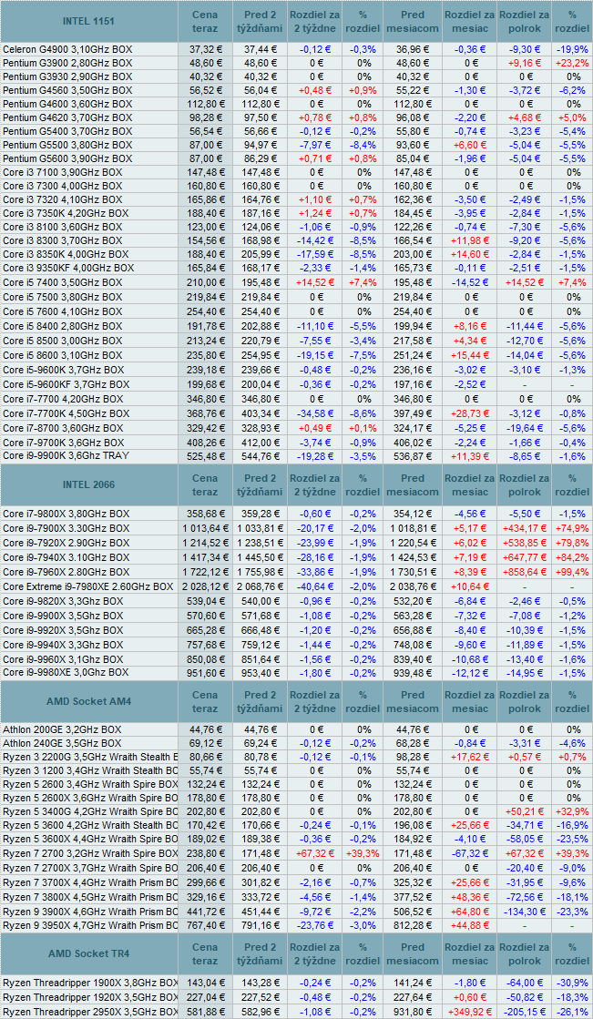 Ceny procesorov Intel sa menili od +7,4% do -8,6%. U modelov AMD nastali zmeny od vysokých +39,3% do -2,2%.