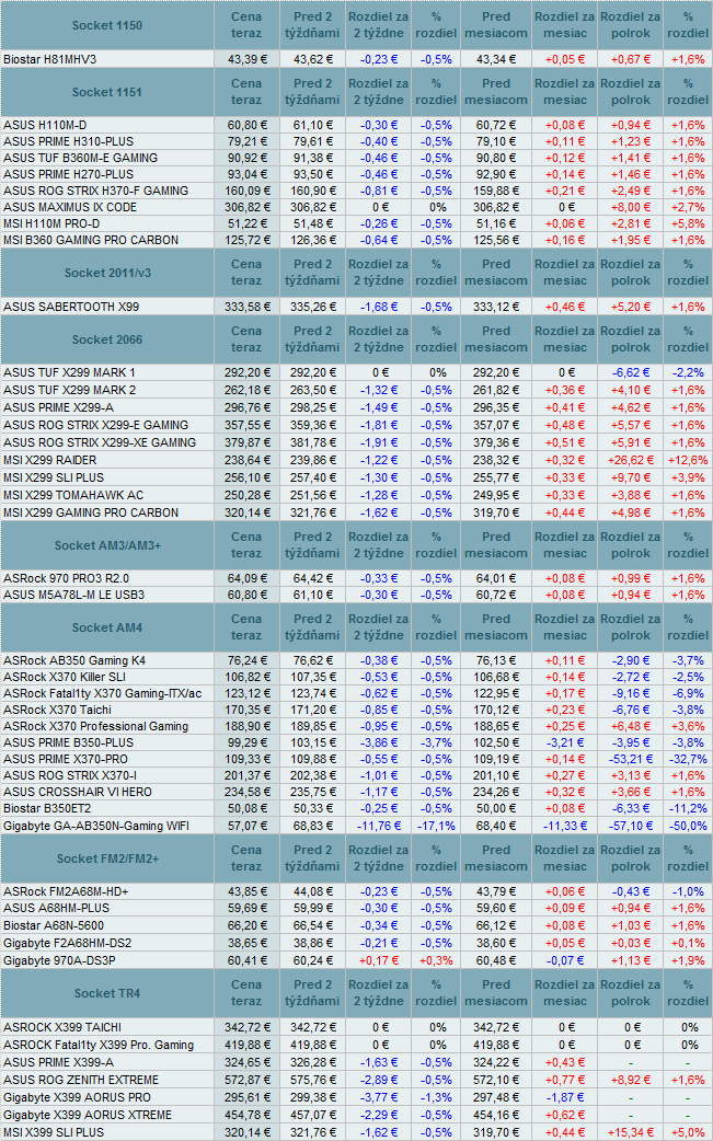 Základné dosky pre INTEL procesory zlacneli do -0,5%. Dosky pre modely AMD menili ceny od +0,3% až do -17,1%. Z prehľadu vypadli MSI H310M PRO-VH (1151) a ASUS X99-DELUXE II (2011).