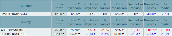 Ceny DVD a Bluray napaľovačiek sa zmenili od +2,0% do -1,3%.