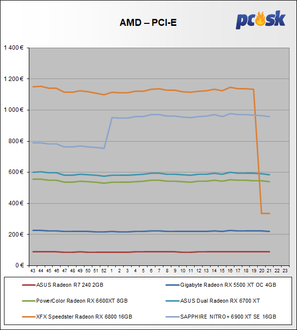 Grafické karty zlacneli do -1,1%, avšak jeden model zaznamenal pokles ceny až o 70,3% - to bude pravdepodobne len anomália v cenníku a cena sa čoskoro vráti na správnu hodnotu.