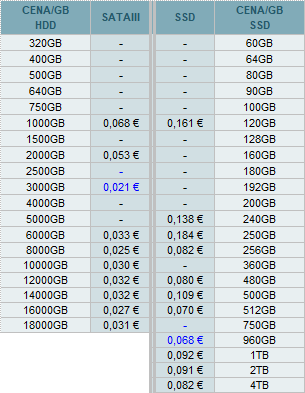 Najlepšie ceny za 1GB diskovej kapacity sú nasledovné: SATAIII 3TB a SSD 960GB.