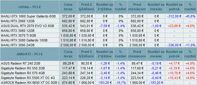 Grafické karty od nVidie mierne zlacneli do -1,4%. U ATI bol pokles až do -18,1%.