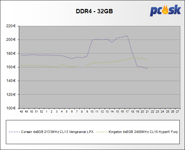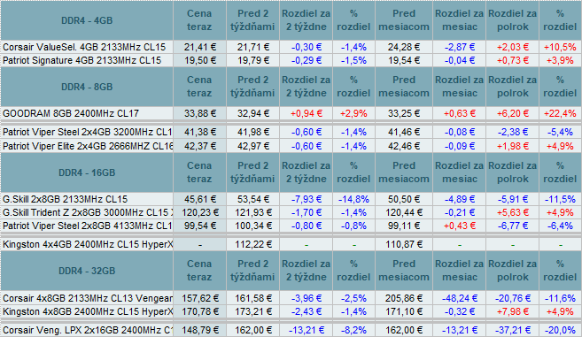 Pamäte DDR3 menili ceny od +1,8% do -1,4%. U DDR4 to bolo od +2,9% až do -14,8%.