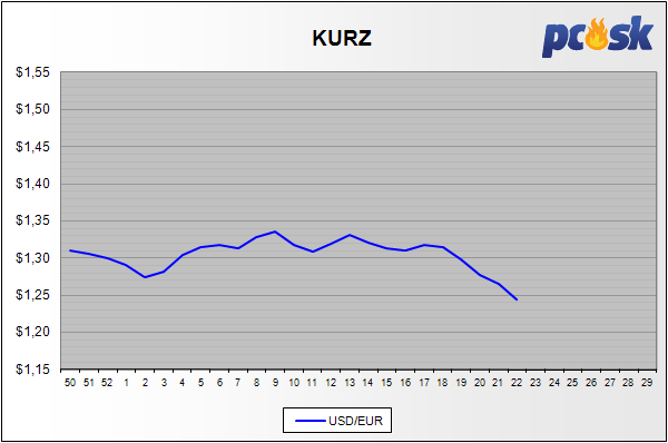 Dolár po 2 týždňoch posilnil. Kurz za posledné 2 týždne klesol o 2,56% na 1,245$ za €. Bol to pokles o 0,032€. Sledované komponenty kolísali nad vývojom kurzu $.