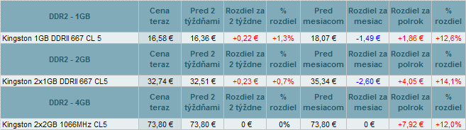 DDR pamäte zdraželi do 0,8% a DDR2 do 1,3%. U DDR3 sa menili ceny od +16,7% do -0,9%.