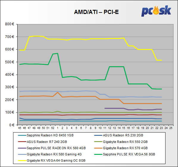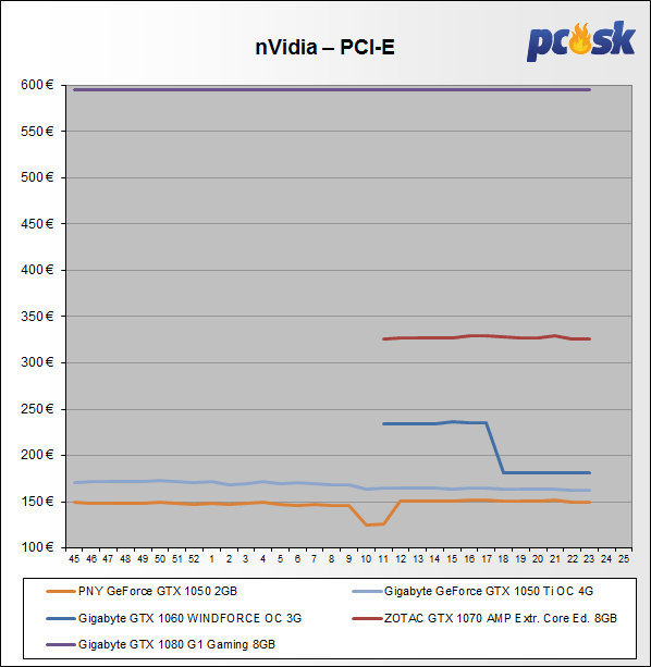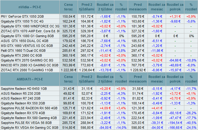 Grafické karty nVidia menili ceny od +0,02€ do -4,1%. U AMD boli zmeny od +3,4% až do -14,0%.