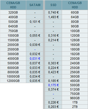 Najlepšie ceny za 1GB diskovej kapacity sú nasledovné: SATAIII 4000GB, SSD 500GB.