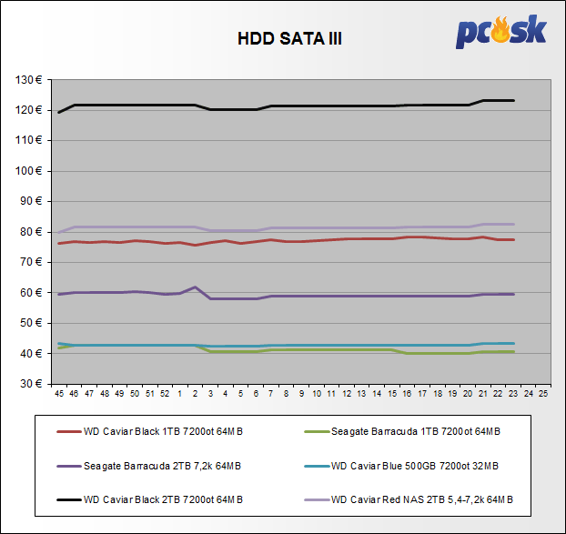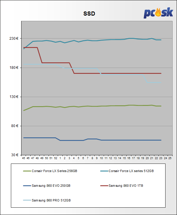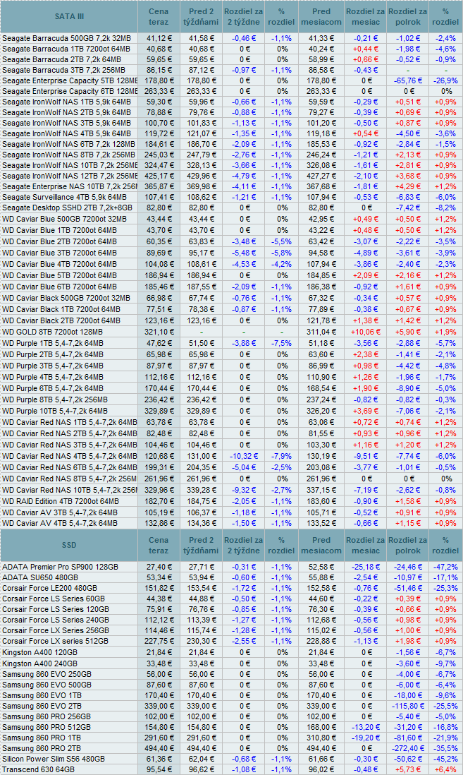 Pevné disky klesli s cenou -7,9% a SSD "len" do -1,1%. Z prehľadu vypadol SSD Transcend 370 512GB.