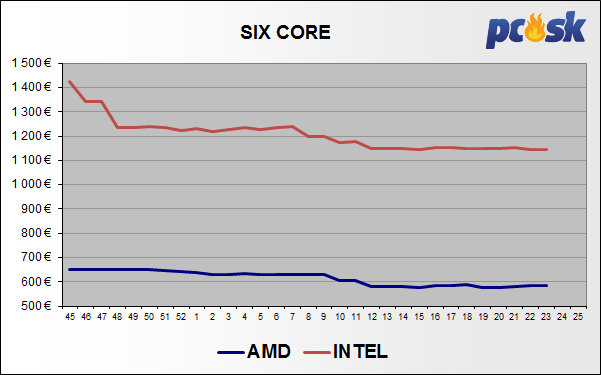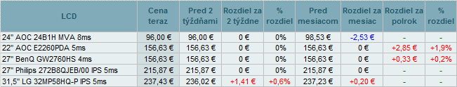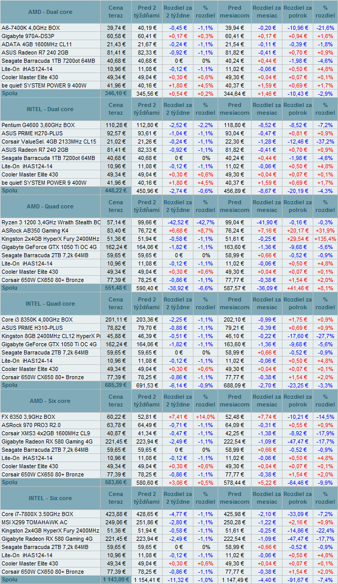 Ceny zostáv kolísali od +0,5% až do -6,6%. Zmena nastala u 4-jadrovej zostavy AMD, kde FX 6350 3,9GHz BOX nahradil vypadnutý FX 6300 3,5GHz BOX.