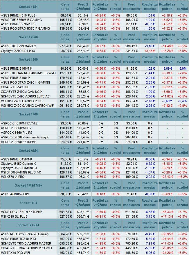 Ceny základných dosiek sa menili do +0,3%.