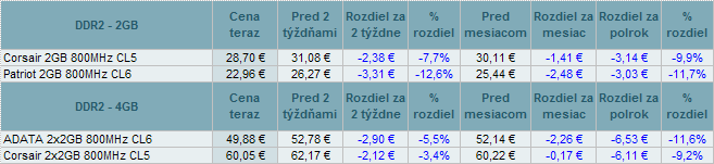 Pamäte DDR a DDR2 celoplošne zlacneli až do 12,6%. U modelov DDR3 nastali zmeny od +0,4% do -9,0%. Do prehľadu som pridal výber pamätí DDR4.