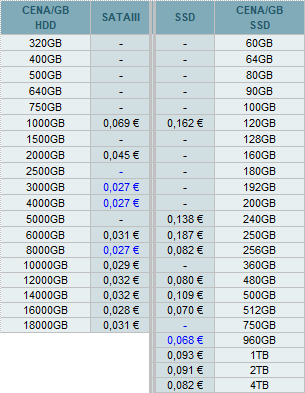 Najlepšie ceny za 1GB diskovej kapacity sú nasledovné: SATAIII 3TB, 4TB, 8TB a SSD 960GB.