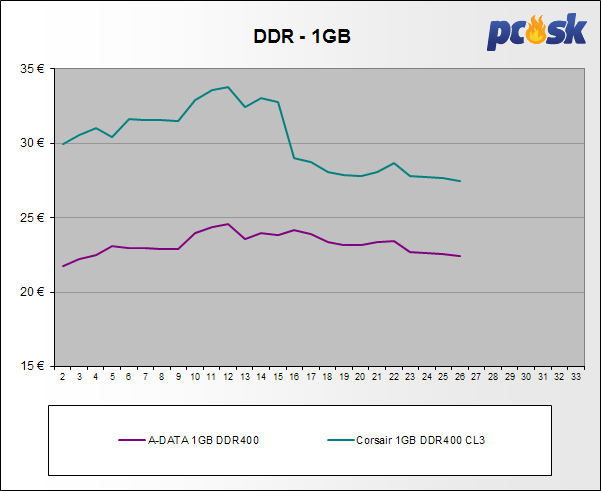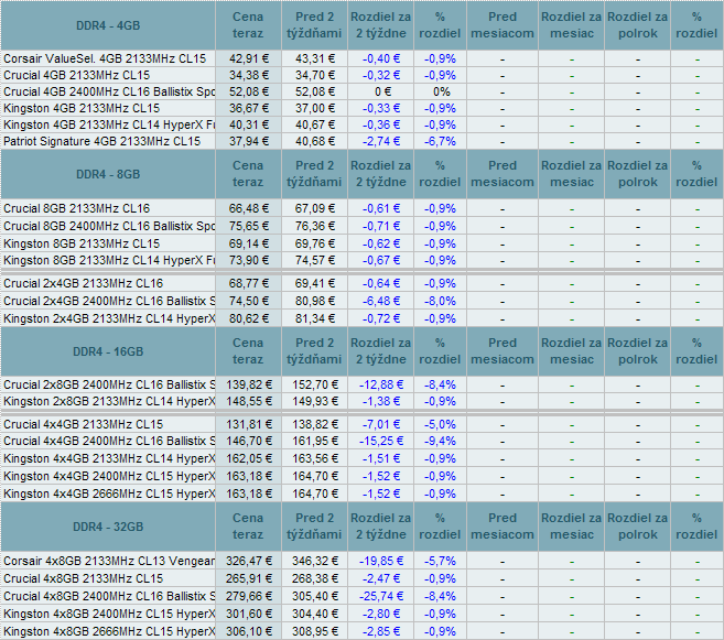 Všetky modely DDR pamätí za uplynulé týždne zlacneli až do 15,5%. Z prehľadu vypadla DDR3 pamäť Kingston 2x4GB 2666MHz CL11 XMP.