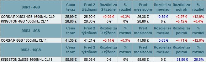 Pamäte DDR3 zdraželi do +0,3%. U DDR4 nastal nárast cien ať do +43,0%. DDR5 tiež zdraželii do +0,4%.