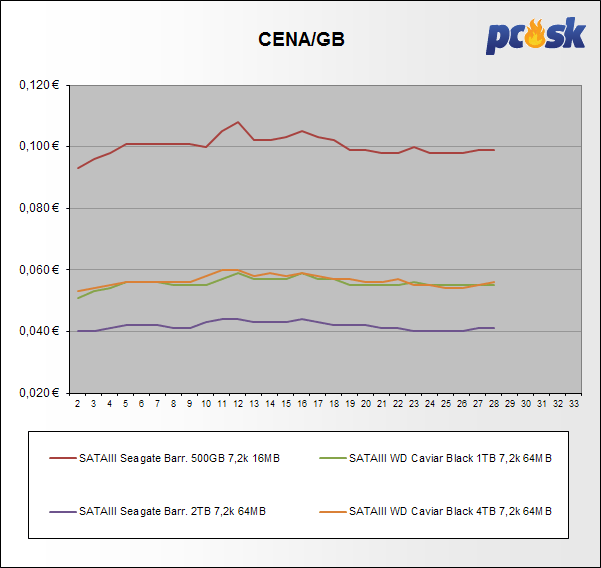 Najlepšie ceny za 1GB diskovej kapacity sú nasledovné: SATAII na 500GB, SATAIII na 3000GB. U SSD MLC to je 256GB.