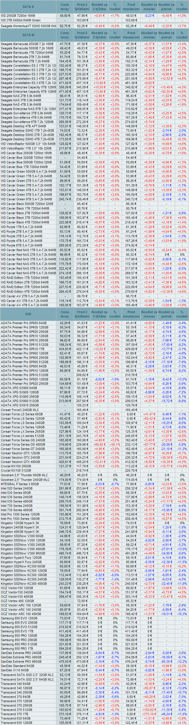 Klasické pevné disky menili ceny do +3,1%. U SSD nastali zmeny od +39,1% do -5,6%. Z prehľadu vypadol SSD Corsair Force Series GT 120GB.