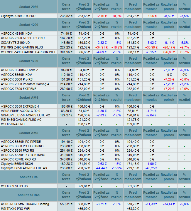 Základné dosky pre Intel menili ceny od vysokých +18,2% do -1,5%. U AMD nastalo zlacnenie až do -15,9%.