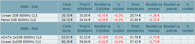V uplynulých týždňoch všetky modely pamätí zdraželi do 1,6%. Z prehľadu vypadli ddr3 modely Kingston HyperX 8x4GB 1600MHz CL9 a Kingston 4x8GB 1333MHz CL9.