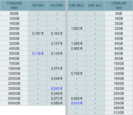 Najlepšie ceny za 1GB diskovej kapacity sú nasledovné: SATAII na 500GB, SATAIII na 3000GB. U SSD MLC to je 256GB.