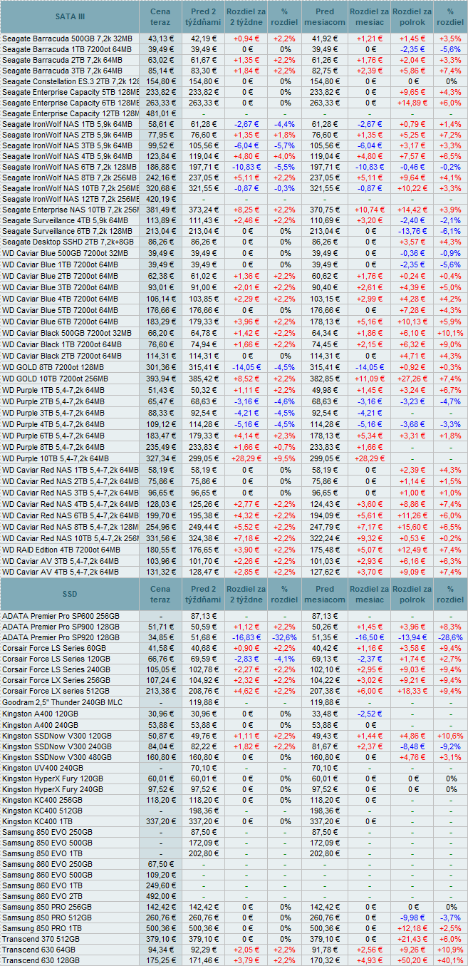 Klasické pevné disky menili ceny od +9,5% do -5,5% a SSD od +2,2% až do -32,6%. Z prehľadu vypadol SSD Kingston UV400 120GB.