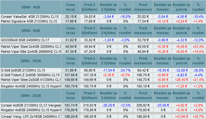 Pamäte DDR3 menili ceny od +4,5% do -1,8%. U DDR4 nastali zmeny od +0,3% až do -24,7%.