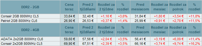 Ceny DDR a DDR2 zdraželi do 3,6%. U DDR3 nastali zmeny od +6,1% do -8,2%.