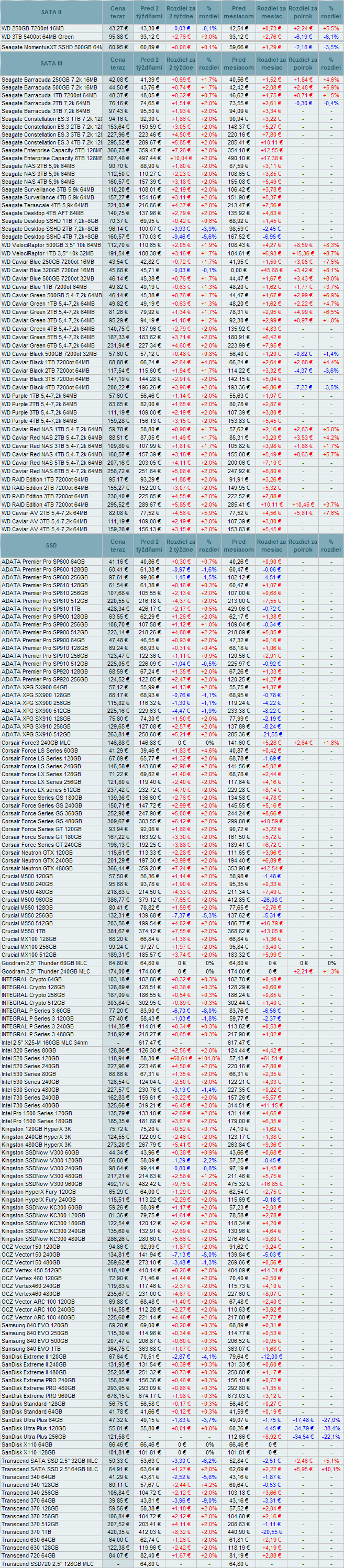 Pevné disky menili ceny od +5,9% do -5,6%. U SSD nastali zmeny od +104,0% do -9,0%. Nárast o vyše 100% som preveroval a nie je to chyba v cenníkoch, ale reálny nárast.