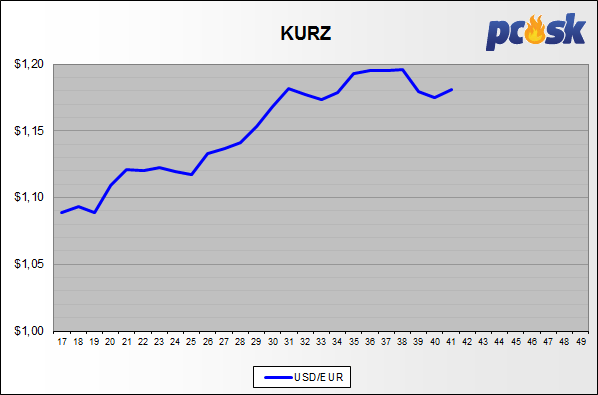 Kurz dolára za posledné 2 týždne stúpol o 0,11% na 1,181$ za €. Bol to nárast o 0,001$. Sledované komponenty kolísali nad vývojom kurzu $.