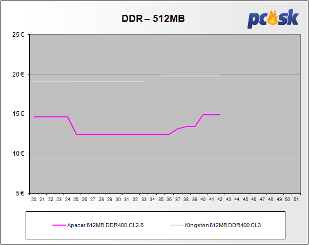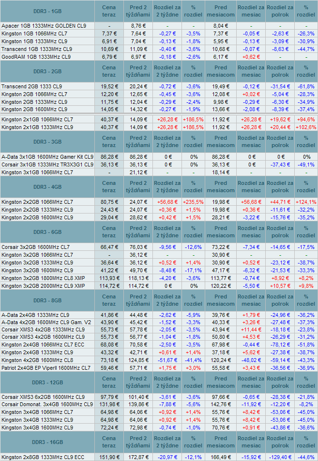 Ceny pamätí sa menili v hojnom počte, avšak nastali aj "brutálne" skoky. U DDE boli zmeny od +10,4% do -3,1%. U DDR2 to bolo od +7% do -6,8%. Najvýraznejšie zmeny nastali u DDR3 pamätí. Niekoľko modelov zlacnelo až do 41,4%, čo nás celkom teší, avšak ďalšie modely šli s cenami nahor až do závratných 235,5%.