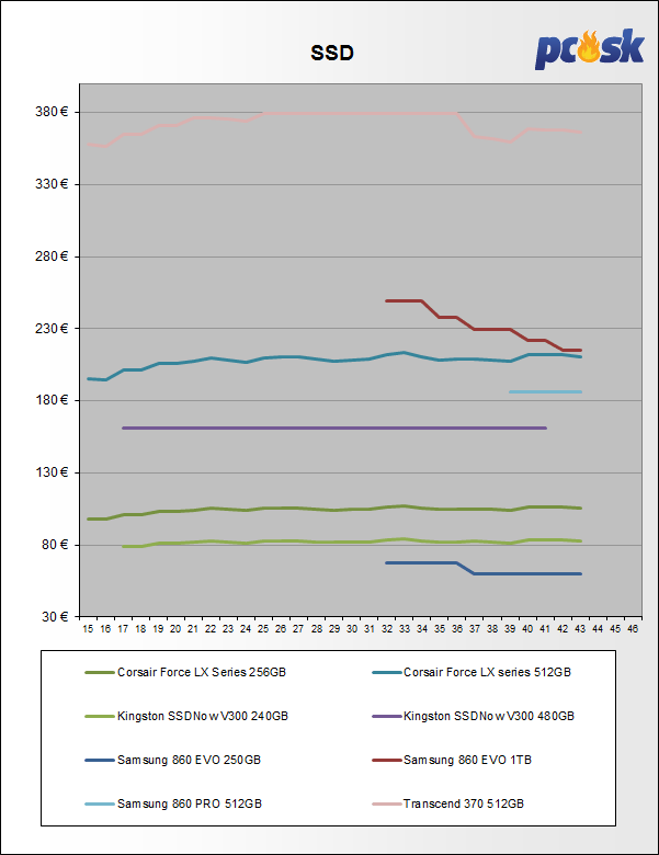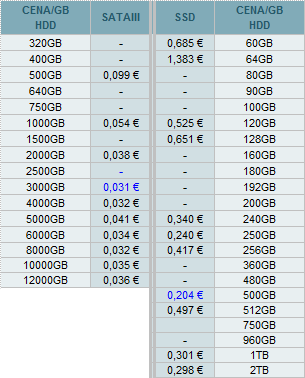 Najlepšie ceny za 1GB diskovej kapacity sú nasledovné: SATAIII na 3000GB, SSD na 500GB.