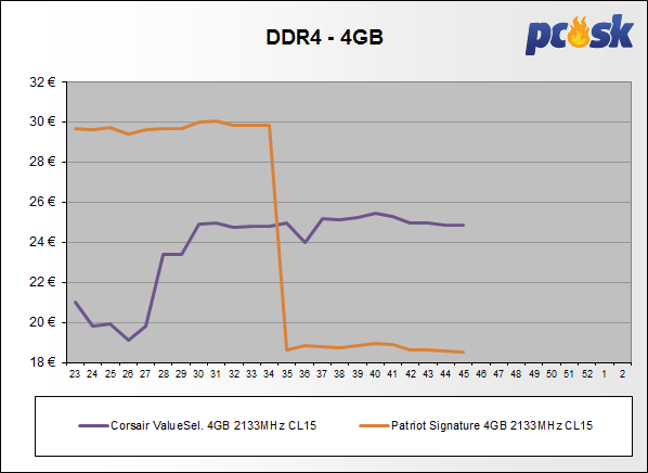 Pamäte DDR, DDR2 a DDR3 zlacneli do -3,3%. U DDR4 boli zmeny od +0,5% až do -30,1%. Z prehľadu vypadla pamäť Crucial 2x16GB 2666MHz CL19 (DDR4).
