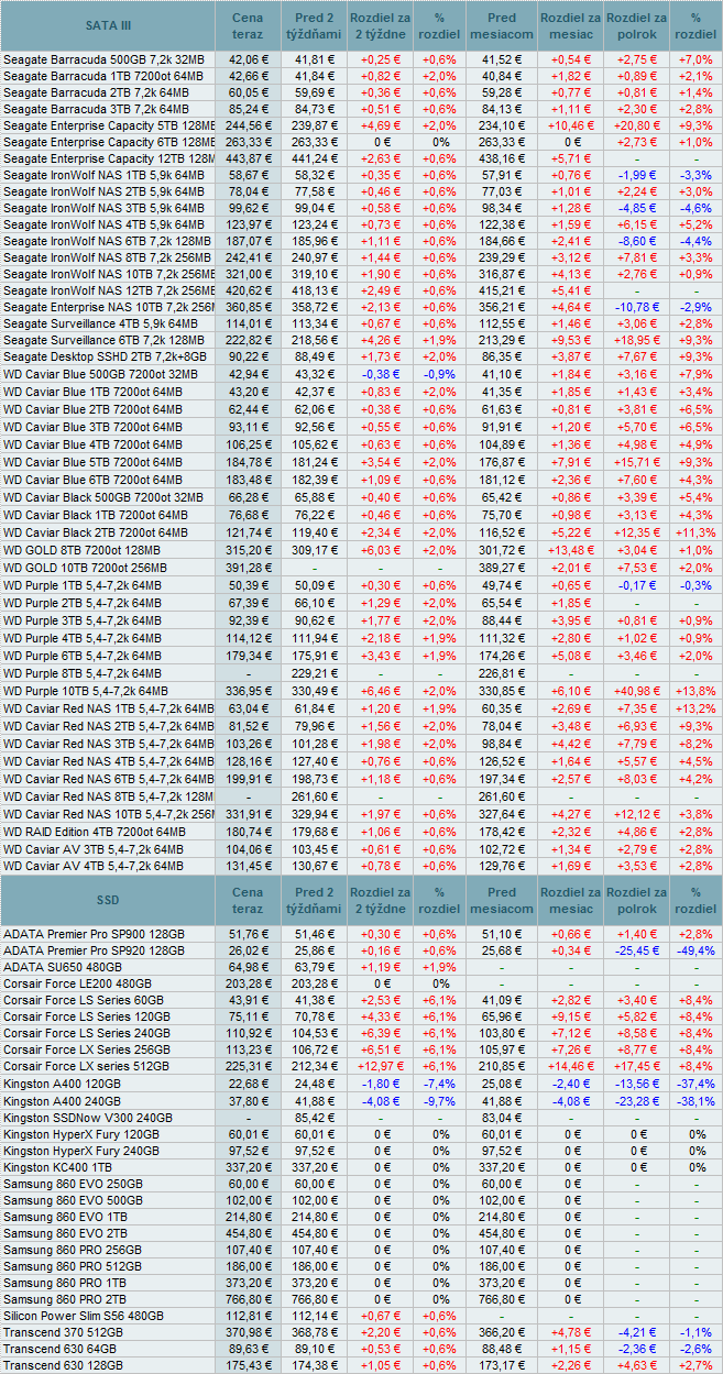 Klasické pevné disky menili ceny od +2,0% do -0,9% a SSD od +6,1% do -9,7%.