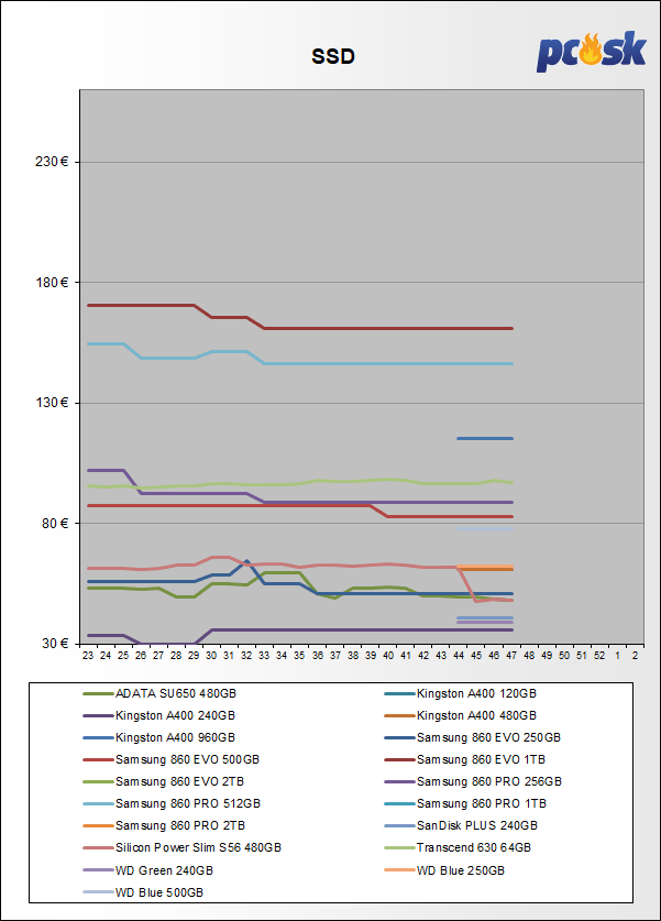 Pevné disky menili ceny od +0,9% do -9,7%. U SSD to bolo od +0,9% do -2,7%.