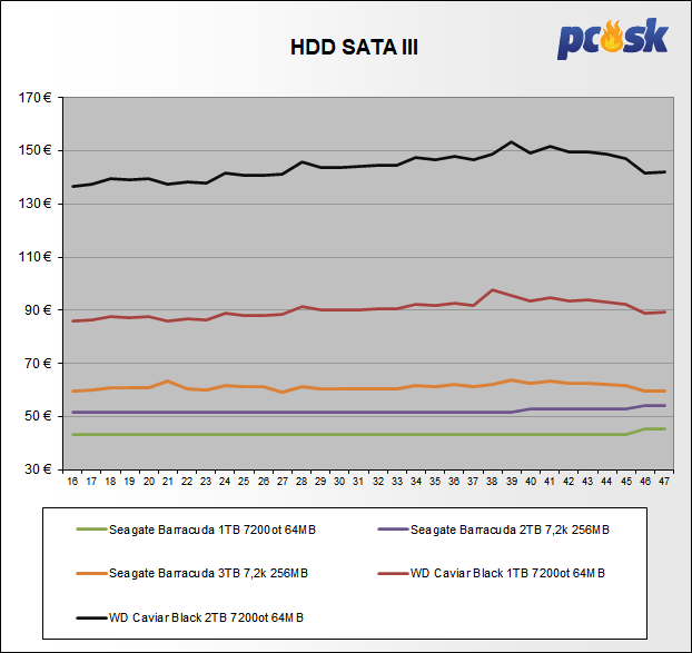 Najlepšie ceny za 1GB diskovej kapacity sa zmenili nasledovne: SATAIII 4000GB a SSD 2TB.