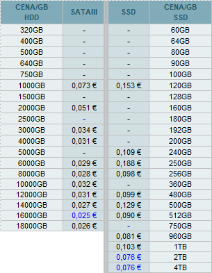 Najlepšie ceny za 1GB diskovej kapacity sú nasledovné: SATAIII 16TB, SSD 2TB a 3TB.