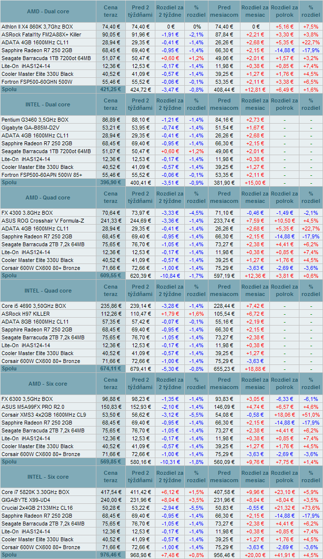 Ceny zostáv sa zmenili od +0,8% do -1,8%. V 4-jadrovej zostave INTEL vypadla doska MSI H97 GAMING3, ktorú nahradila ASRock H97 KILLER.