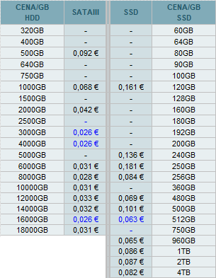 Najlepšie ceny za 1GB diskovej kapacity sú nasledovné: SATAIII 3TB/4TB/16TB a SSD 512GB.