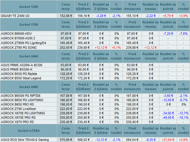 Základné dosky menili ceny len mierne a to od +5,1% do -2,1%.