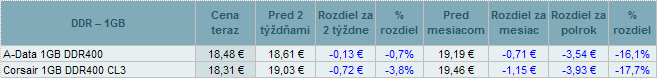 Ceny DDR pamätí sa menili do -3,8%. Pamäte DDR2 menili ceny od +6,2% do -0,3%. U DDR3 boli zmeny od +13,8% až do -11,7%. Z prehľadu vypadli DDR3 pamäte Kingston 3x1GB 2000MHz CL9 XMP a Kingston 2GB 1333MHz CL9.