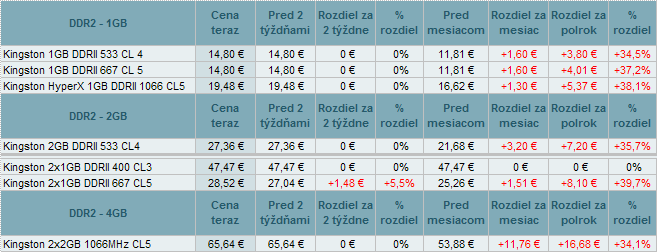 Trh s pamäťami sa za posledné 2 týždne skoro nemenil. U DDR modulov boli síce zlacnenia do 9,9%, u DDR2 zdražel len jeden modul a aj ten len o 5,5%. U DDR3 pamätí šli ceny dole do 2,5%. Z prehľadu vypadli A-Data 1GB DDRII 800 a Kingston 2x2GB 800MHz CL5 (DDR2), A-Data 3x1GB 1600MHz Gamer Kit CL9 (DDR3).
