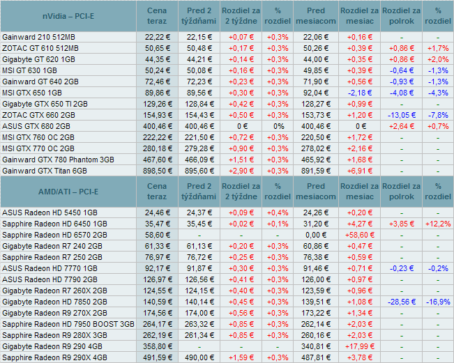 Ceny väčšiny grafických kariet šli nahor do 0,4%. Z prehľadu vypadli: Gigabyte GTX 690 4GB, Sapphire Radeon HD 6570 1GB, Sapphire Radeon HD 6670 1GB, Sapphire Radeon HD 7750 1GB a ASUS Radeon HD 7870 2GB.